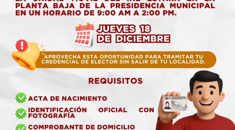La Unidad Móvil del INE estará brindando atención en la planta baja de la Presidencia Municipal, para que puedas realizar tu trámite de credencial para votar sin salir de tu localidad.