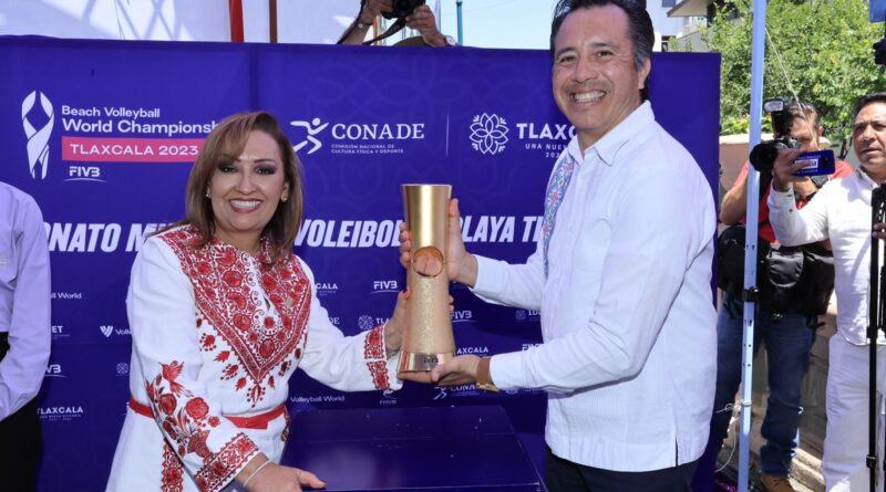 Como parte de las actividades de promoción del Campeonato Mundial de Voleibol de Playa Tlaxcala 2023, que se llevará a cabo del 5 al 15 de octubre, la gobernadora Lorena Cuéllar Cisneros y su homólogo de Veracruz, Cuitláhuac García Jiménez, develaron el trofeo que será entregado a los finalistas.