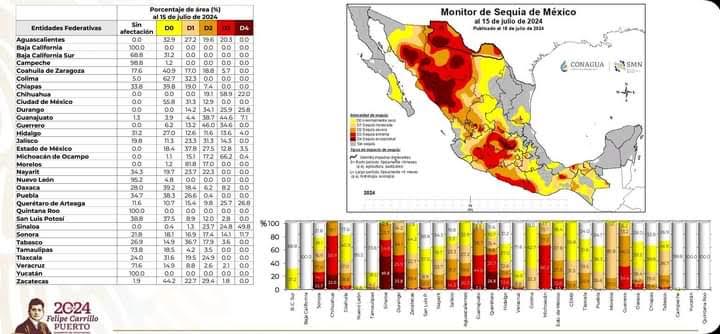 Sin embargo, se mantuvo el ambiente de caluroso a muy caluroso con temperaturas superiores a los 45 centígrados en diversas regiones del país. Por lo que, áreas con sequía de severa a excepcional (D2 a D4) se mantienen en el noroeste, centro y occidente de México. A nivel nacional, el porcentaje de áreas con sequía de moderada a excepcional (D1 a D4) es de 51.22 por ciento, 3.49 por ciento menor que lo registrado a finales de junio de 2024.