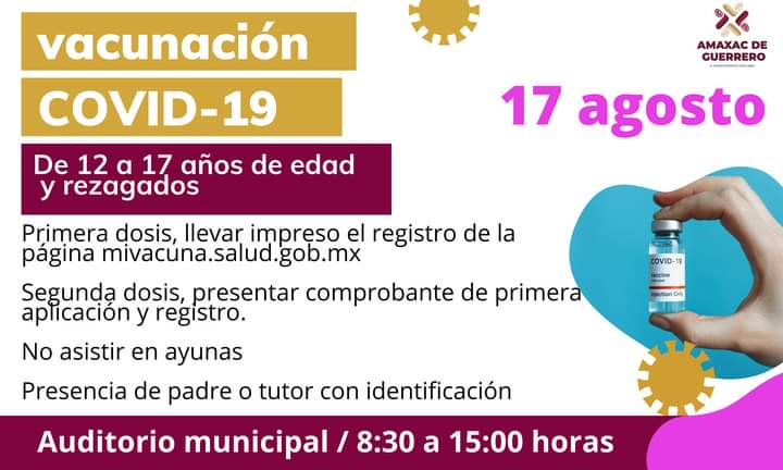 El ayuntamiento de Amaxac de Guerrero, informa que ha llegado la Estrategia Nacional de Vacunación contra COVID, al municipio de Amaxac, para aplicar la Primera y Segunda dosis para adolescentes de 12 a 17 años de edad.