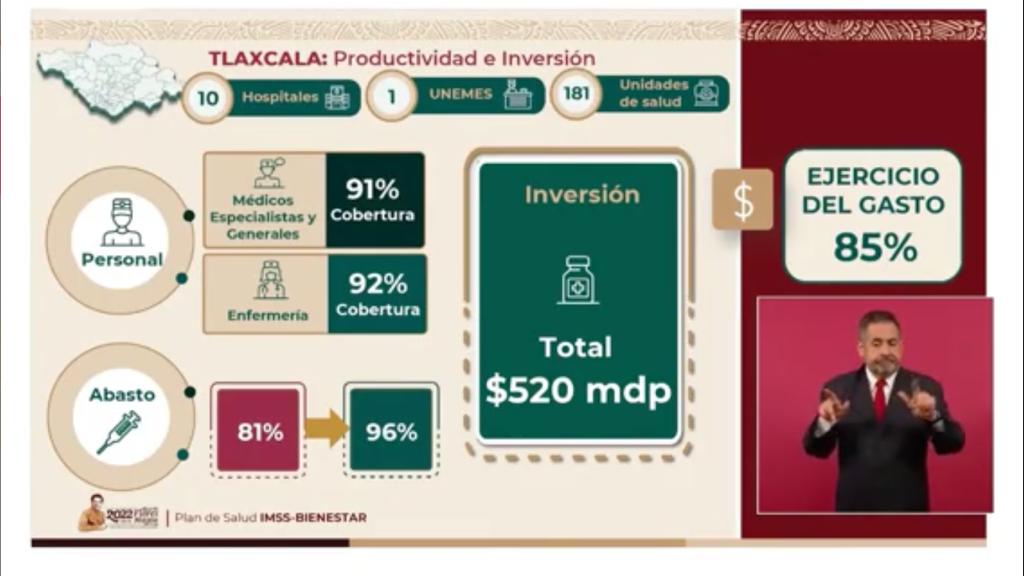 En su intervención durante la conferencia del presidente de la República, Andrés Manuel López Obrador, informó sobre el avance que presenta la entidad tlaxcalteca en la implementación del sistema de Salud IMSS-Bienestar que corresponde al 92 por ciento en el ejercicio del presupuesto de 520 millones de pesos.