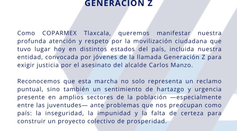 La Confederación Patronal de la República Mexicana (COPARMEX) en Tlaxcala, representada por César Reyes Chávez emitió un pronunciamiento oficial manifestando su profunda atención y respeto por la reciente movilización ciudadana, que tuvo lugar en la entidad y varios estados del país bajo la consigna de la «Generación Z» para pedir justicia por el asesinato del alcalde Carlos Manzo de Uruapan, Michoacán.