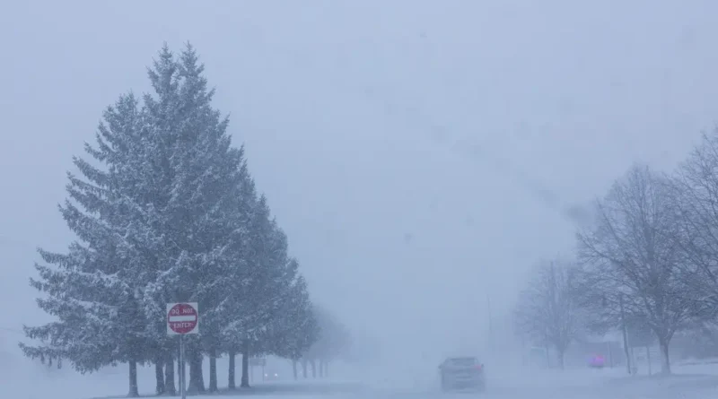 Varios vehículos transitan a lo largo de Lake Michigan Drive durante una advertencia de tormenta de nieve en el condado Ottawa, Michigan, el lunes 19 de enero de 2026
