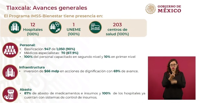 El director general del Instituto Mexicano del Seguro Social (IMSS), Zoé Robledo informó durante la conferencia de prensa matutina del presidente Andrés Manuel López Obrador de este martes, que en Tlaxcala el modelo IMSS-Bienestar tiene presencia en 100 por ciento de las unidades, 12 hospitales y 203 centros de salud, en beneficio de la ciudadanía.