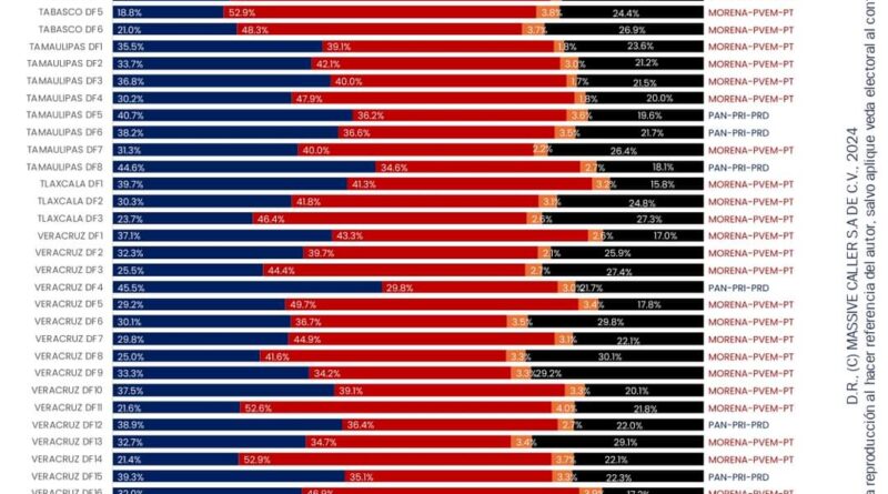 > En este tenor, expone que para el caso del distrito uno, Morena y sus aliados llevan una ventaja de 41.3 por ciento; no obstante, la oposición en el que van los Partido Acción Nacional (PAN), Partido Revolucionario Institucional (PRI) y el Partido Revolución Democrática (PRD), queda en segundo lugar, aunque por muy poco, ya que los separan solo 2 puntos, pues su porcentaje es de 39.7 por ciento, para Movimiento Ciudadano, el porcentaje, es apenas del 3.2 por ciento y un 15.8 por ciento de ciudadanos, aun no define su voto.