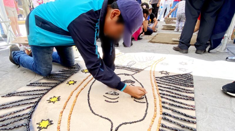 Cómo parte de la conmemoración del Día de la niña y el niño alfombrista, decenas de menores participaron en la elaboración de tapetes y alfombras de arte efímero con la supervisión de dos destacados maestros alfombristas de Huamantla.