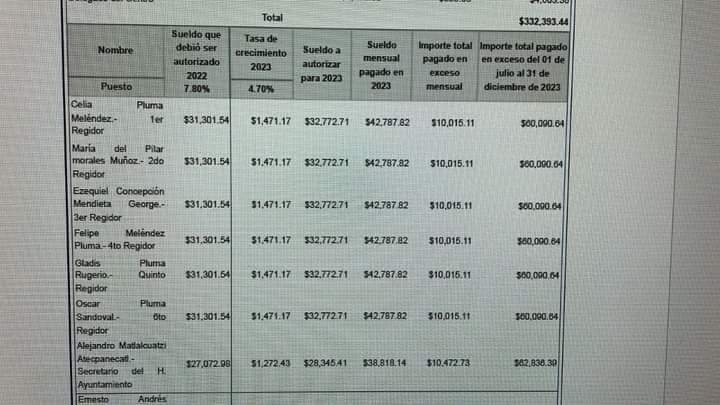 En cuanto a los salarios de los regidores, el sueldo mensual autorizado en el 2023 fue de 32 mil,772 pesos, el sueldo mensual pagado en el 2023: 42 mil,787 pesos, el importe en exceso mensual: 10 mil 015 pesos, el importe pagado anual en exceso: es de 120 mil 180 pesos.