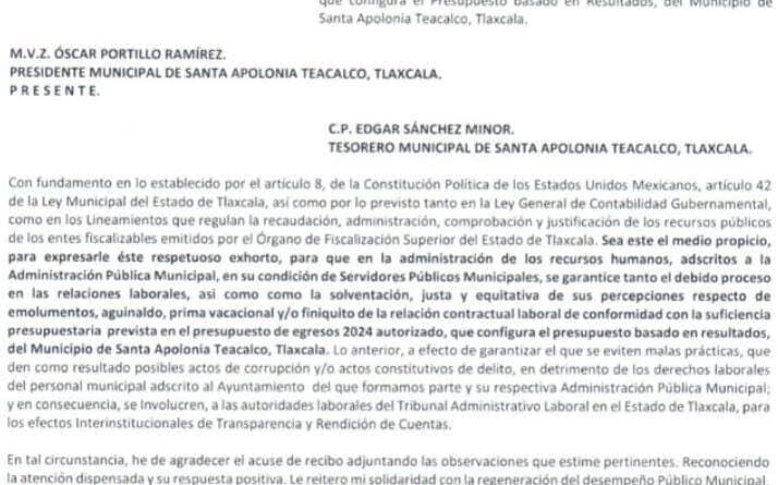 Mediante un documento enviado al Poder Legislativo, mismo que fue turnado a la Comisión de Finanzas y Fiscalización, la representante legal de Santa Apolonia Teacalco exhortó a la autoridad municipal para que se “garantice tanto el debido proceso en las relaciones laborales, con fundamento en lo establecido en las leyes laborales, como la solventación, justa y equitativa de sus percepciones, respecto de sus emolumentos, aguinaldo, prima vacacional y/o finiquito de la relación contractual laboral”.