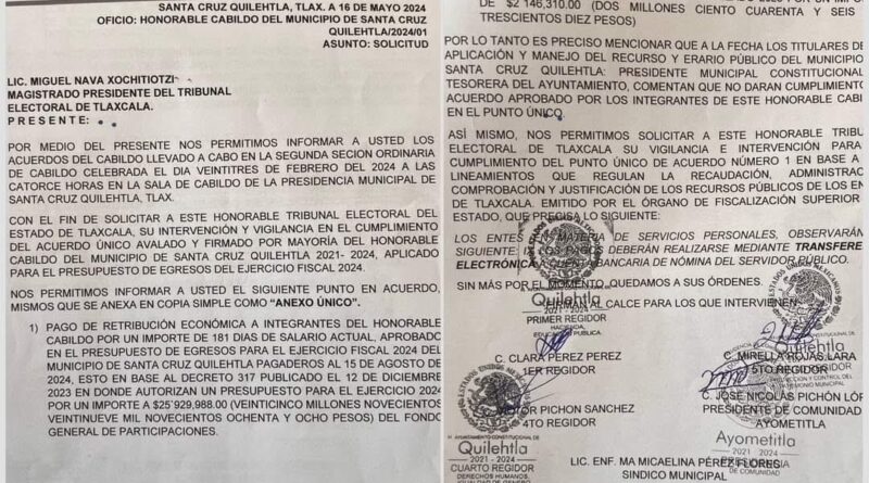 Firmada por la mayoría de los integrantes del cabildo, los regidores entregaron una solicitud al Tribunal Electoral de Tlaxcala (TET) en donde hacen saber que, como único acuerdo de la sesión de cabildo realizada el pasado 23 de febrero, se sienten con el derecho de pedir una cantidad equivalente a 181 días de salario por cada uno de ellos, del presupuesto de egresos de este año.