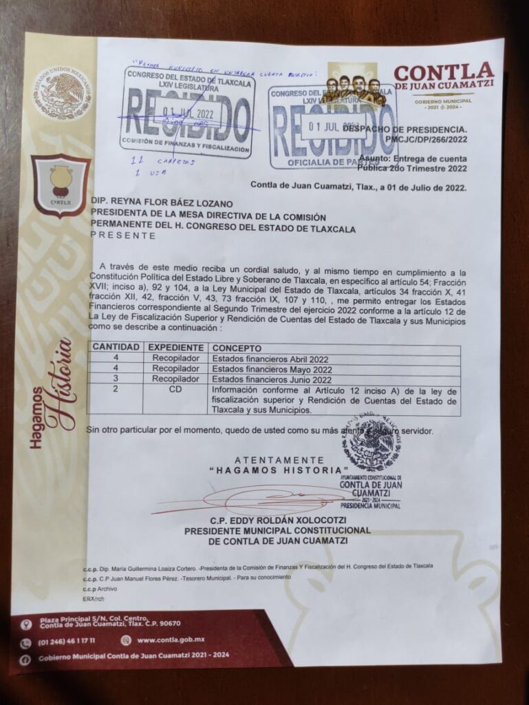 Consolidar al Gobierno Municipal de Contla de Juan Cuamatzi, como un referente de transparencia y que dé cumplimiento de manera puntual a la rendición de cuentas; es un tema primordial para el Presidente Municipal, Eddy Roldán; por ello, la mañana de este viernes, acompañado del Tesorero y del Director de Egresos, entregó a la Comisión de Finanzas del Congreso Local, los estados financieros correspondientes a los meses de abril, mayo y junio del 2022; convirtiéndose en el primer alcalde en la historia del municipio sarapero, que lidera en dos ocasiones, la entrega de cuentas en el Estado de Tlaxcala.