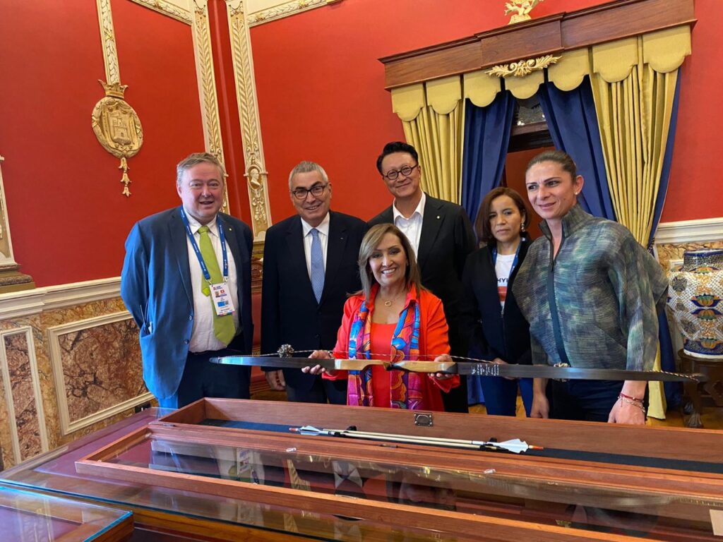 Posterior al encuentro deportivo, el presidente de la Federación Mundial de Tiro con Arco, Ugur Erdener; el vicepresidente, Thomas Kyu Han y el secretario general, Tom Dielen, entregaron a la mandataria estatal un arco conmemorativo de la edición 16 de la Final de la Copa del Mundo de Tiro con Arco.