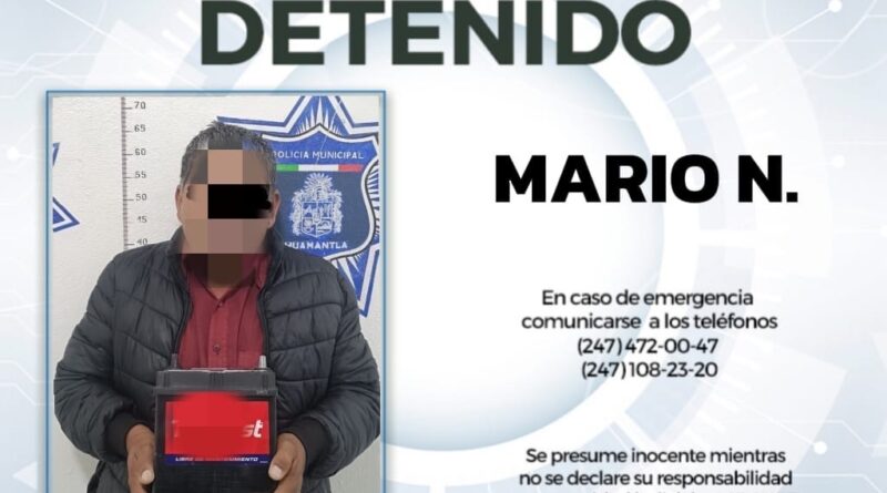 Gracias a la rápida y efectiva acción de los elementos de la Dirección de Seguridad Pública de Huamantla, se logró la detención de un individuo del sexo masculino en posesión de una pila de automóvil, a minutos de haber sido sustraída de manera ilegal de un comercio ubicado en el bulevar Luis Donaldo Colosio.