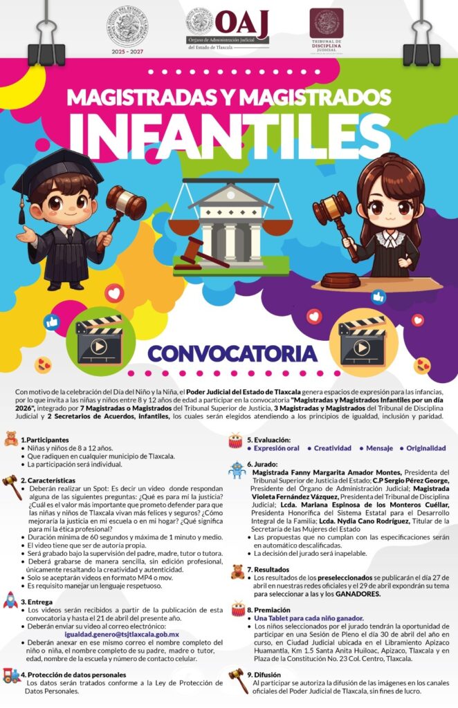 Con la finalidad de generar espacios de expresión para las infancias tlaxcaltecas, el Poder Judicial de Tlaxcala, abrió la convocatoria para la edición 2026 de “Magistradas y Magistrados Infantiles por un Día” donde las niñas y niños de la entidad, tendrán la oportunidad de participar en la sesión pública a efectuarse el próximo 30 de abril como parte de la celebración del Día del Niño y la Niña.
