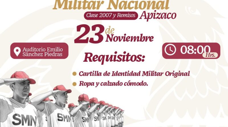 En cumplimiento a las disposiciones de la Secretaría de la Defensa Nacional (Sedena), a través de la 23/a Zona Militar, el Gobierno Municipal de Apizaco convoca a los jóvenes de la clase 2007 y remisos que tramitaron su cartilla de identidad militar durante el presente año, a participar en el sorteo del Servicio Militar Nacional 2025, que se llevará a cabo el 23 de noviembre de 2025, a las 08:00 horas, en el Auditorio Emilio Sánchez Piedras