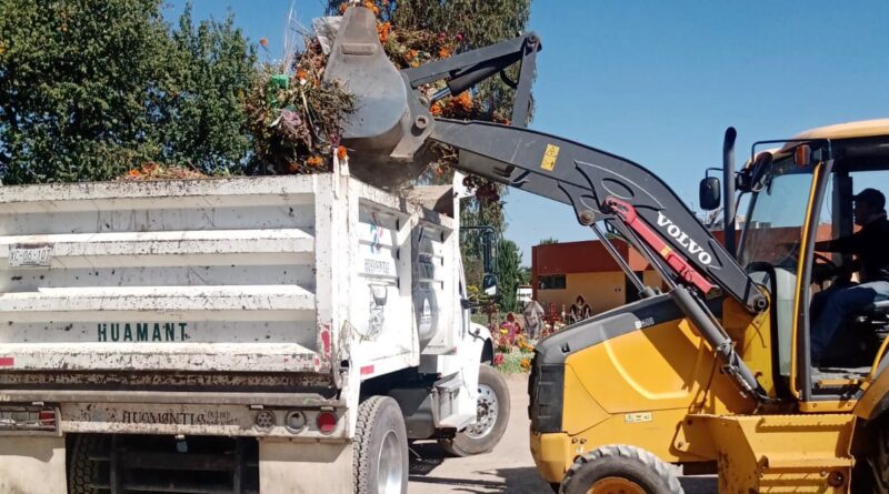 Al momento, en ambos panteones se han recogido más de 110 metros cúbicos de residuos sólidos por personal de dichas áreas; donde realizan la limpieza de jardineras, el retiro de hierba seca y desperdicios de flores, apoyados en algunas zonas con una retroexcavadora.