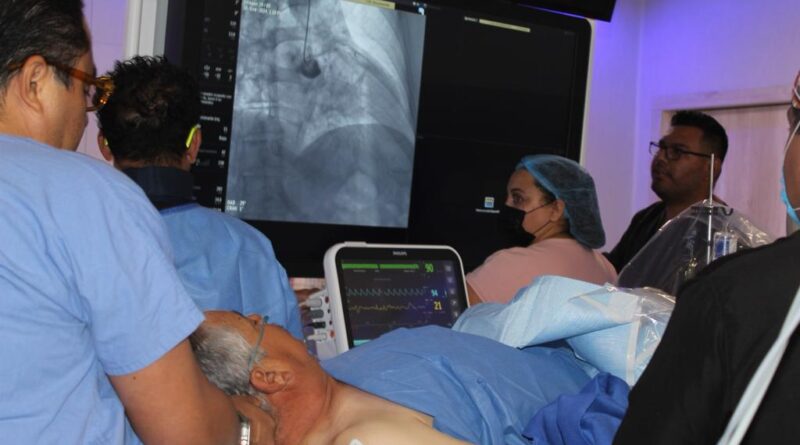 El secretario de Salud, Rigoberto Zamudio Meneses, presenció la primera cirugía de angiografía coronaria que realizó el médico cardiólogo Juan Carlos Pérez Alva y su equipo especializado. Se trata de un procedimiento que, con ayuda del equipamiento tecnológico avanzado, utiliza imágenes por rayos “X” para ver los vasos sanguíneos del corazón, prueba que se hace para ver si hay una restricción en el flujo sanguíneo que va al corazón, como fue el caso del primer paciente.