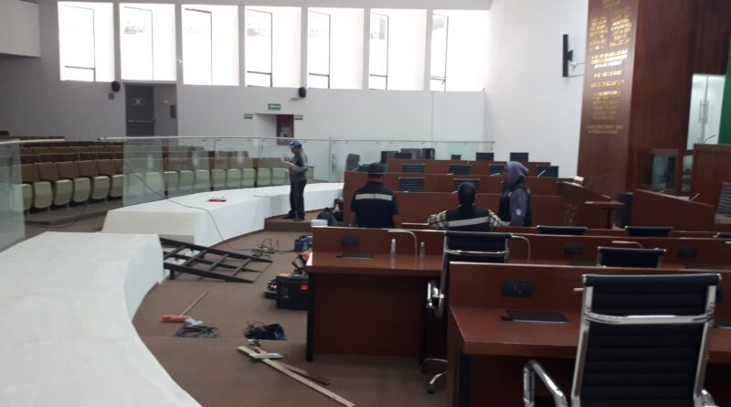 Desde el pasado viernes iniciaron las adecuaciones al pleno, el cual fue valorado por un profesional en la materia y de acuerdo a la asesoría, en el acceso de la parte frontal del pleno se colocará una rampa, priorizando la funcionalidad y seguridad de la diputada Gabriela Hernández Islas y en dado momento de las personas que ingresen por esta vía.