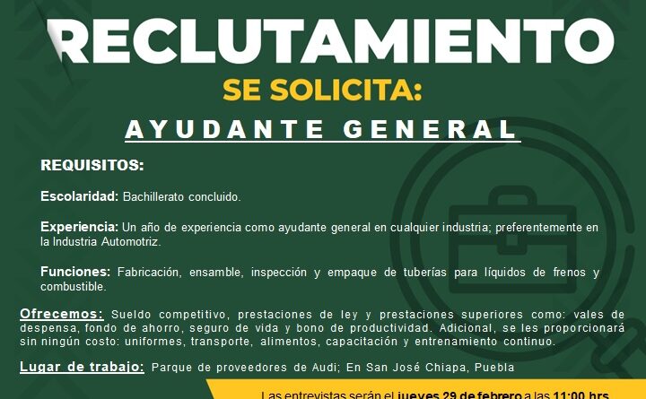 El H. Ayuntamiento de Huamantla, en colaboración con la empresa TI Fluid Systems del ramo automotriz, anuncia que realizará un reclutamiento para contratar a personal como ayudantes generales, este jueves 29 de febrero.