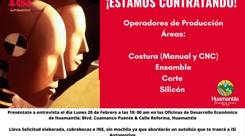 Este reclutamiento se realizará en las instalaciones de ISI Automotive, por lo que los aspirantes deberán presentarse en las oficinas de la Coordinación de Desarrollo Económico y Comercio de Huamantla, ubicadas en bulevar Cuamanco esquina con Reforma S/N, el lunes 20 de febrero a las 10:00 horas.