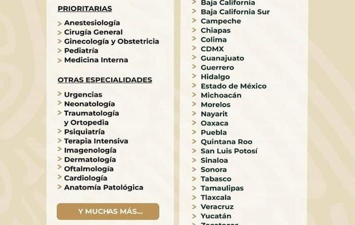 Mediante redes sociales el Instituto Mexicano del Seguro Social dio a conocer las vacantes disponibles dentro del programa, y los médicos que podrán participar son especialidades prioritarias como Anestesiología, Cirugía General, Ginecología y Obstetricia, Pediatría y Medicina Interna.