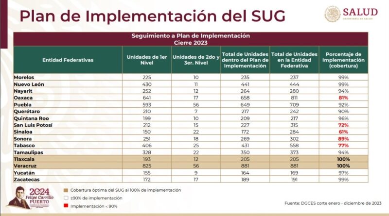 A través de la dirección general de calidad y educación en salud del gobierno federal, se informó el seguimiento al Plan de Implementación de este sistema, mismo que en Tlaxcala se aplicó en sus 12 hospitales, así como en las 193 Unidades Médicas y Centros de Salud de primer nivel, cumpliendo un total de 205 unidades dentro del Plan de Implementación que representan el 100 por ciento de cobertura del SUG.