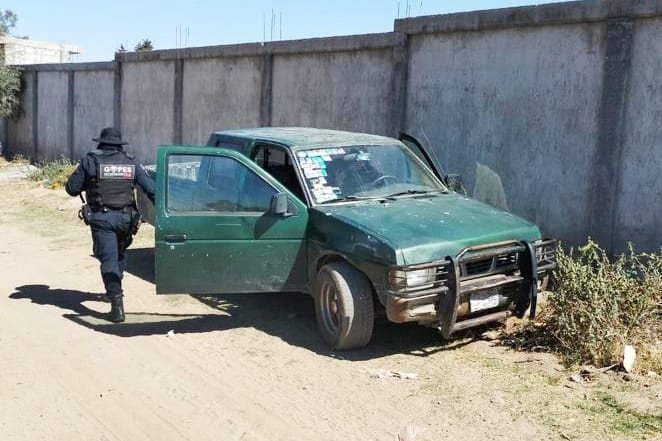 Fue en la comunidad de Lázaro Cárdenas sobre el camino que conduce al panteón, que los uniformados ubican una camioneta marca Nissan doble cabina color verde con placas de circulación del estado de Tlaxcala que reunía las características de la unidad reportada.