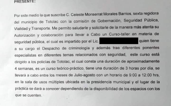 A través de una solicitud, documento al que tuvo acceso Abc Noticias de Tlaxcala, la regidora Morales Barrientos informa la gestión de un supuesto curso de capacitación para policías, sin que explique quién impartirá las sesiones.