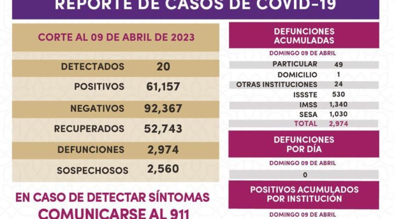 Los datos registrados en la plataforma nacional del Sistema de Vigilancia Epidemiológica de Enfermedades Respiratorias (Sisver), confirmaron 20 casos positivos de Covid-19 y cero defunciones, el 9 de abril de 2023 en la entidad.