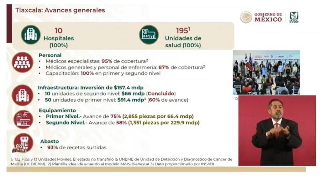 El director general del Instituto Mexicano del Seguro Social (IMSS), Zoé Robledo Aburto informó que en el estado de Tlaxcala se tiene un avance de equipamiento del 75 por ciento en el primer nivel de atención y del 58 por ciento en la compra de piezas médicas para los 10 hospitales de IMSS-Bienestar.