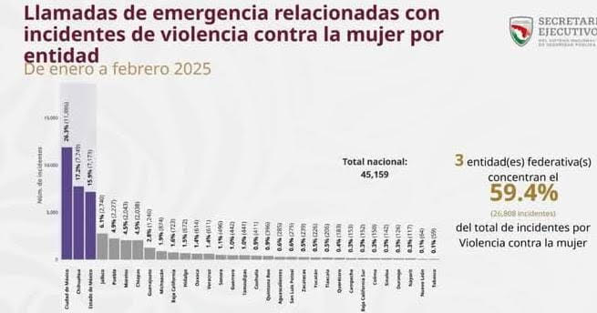 En 2024, se reportaron 1,710 llamadas por presunta violencia contra la mujer; En Violencia de pareja, se contabilizaron 4 mil 558 llamadas, ubicando al estado en el lugar 16.