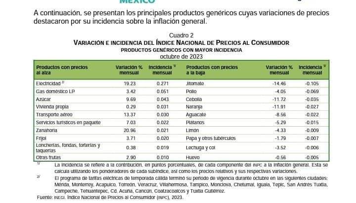 Respecto a la variación de precios en productos y servicios, los aumentos más importantes se vieron en el costo del kilo de zanahorias con 20.96; la tarifa de electricidad, con 19.23; transporte aéreo 13.37; y el azúcar con aumentos de 9.69 por ciento; servicios turísticos en paquete 7.03; el frijol con 3.71; gas doméstico LP, 3.42; otras frutas 2.90; loncherías, fondas, torterías y taquerías con 0.38 y vivienda propia 0.29.