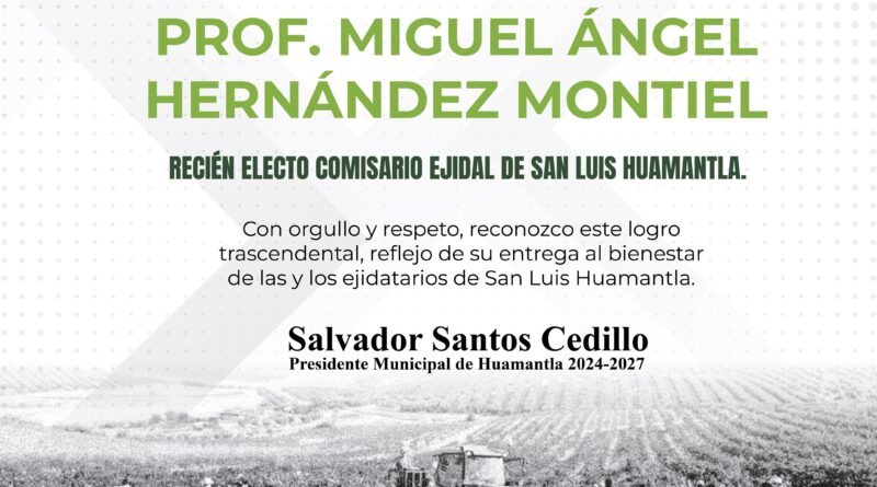 El presidente municipal de Huamantla, Salvador Santos, felicitó al C. Miguel Ángel Hernández Montiel, quien resultó electo como nuevo comisariado ejidal de San Luis Huamantla tras una jornada democrática y participativa celebrada el pasado domingo 22 de junio.