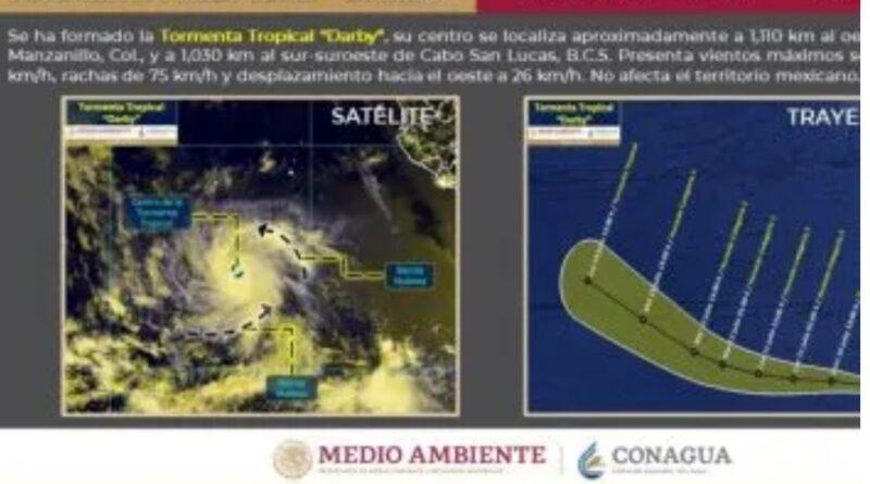 En un comunicado, la Comisión Nacional del Agua señaló que «a las 16:00 horas, tiempo del centro de México, se formó la tormenta tropical «Darby» en el océano Pacífico.