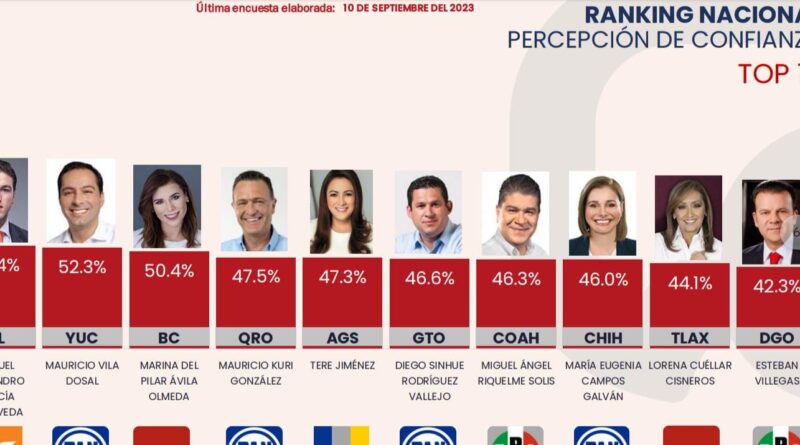 La última encuesta elaborada el pasado 10 de septiembre del año en curso da cuenta que en el top 10 se coloca en el primer sitió Nuevo León, con 53.4 %, seguido de Yucatán, 52.3 %; Baja California, 50.4 %; Querétaro, 47.5 %; Aguascalientes, 47.3%; Guanajuato, 46.6 %; Coahuila, 46.3 %; Chihuahua, 46 %; Tlaxcala 44.1 % y Durango con el 42.3 en relación a la mayor percepción de confianza.