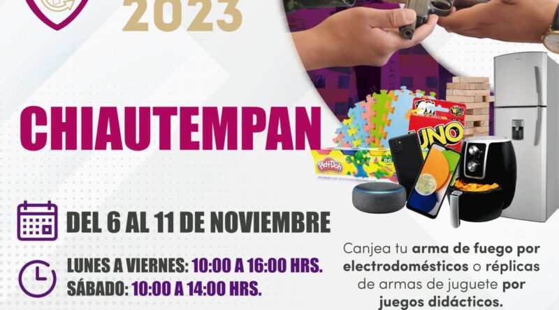 El municipio de Chiautempan  será sede de la campaña de Canje de Armas 2023, implementada por la Comisión Ejecutiva del Sistema Estatal de Seguridad Pública (CESESP), para inhibir en la presencia de armas y juguetes bélicos en los hogares.