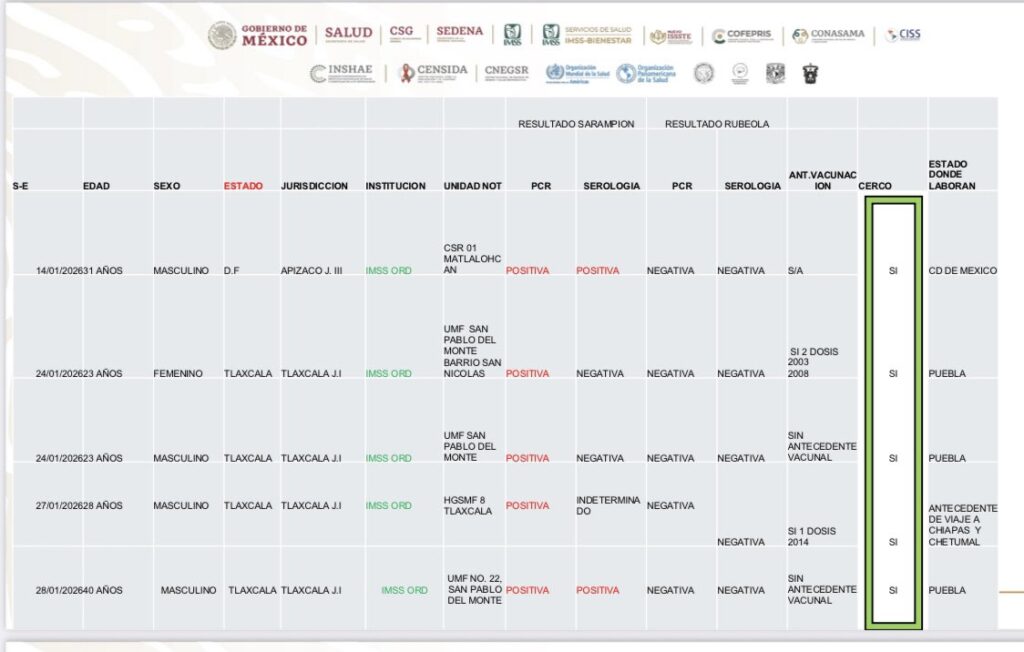 Las tablas que Zamudio expuso en la publicación revelaron que solo en dos días Tlaxcala incrementó tres casos de sarampión, mientras que, desde la aparición del primero, el 14 de enero, y hasta 12 días después, solo aparecieron 5 resultados positivos.