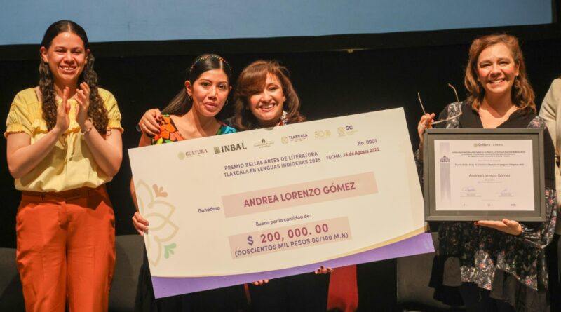 En una ceremonia conjunta con el gobierno de Tlaxcala y el Instituto Nacional de Bellas Artes y Literatura (INBAL) se celebró la entrega de la primera edición del Premio Bellas Artes de Literatura Tlaxcala en Lenguas Indígenas 2025. El galardón fue entregado a la escritora zapoteca Andrea Lorenzo Gómez por su obra Xaga Tlhaz «Mejillas de Durazno», en palabras de la gobernadora Lorena Cuéllar Cisneros, la entrega del premio literario demuestra que «la palabra tiene raíz, tiene memoria y tiene alas».