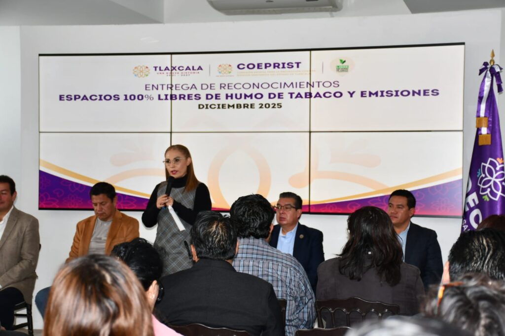 Durante la entrega de reconocimientos, la titular de la Coeprist, Mónica Yazmín Jiménez Gutiérrez, destacó que la iniciativa cumple con las políticas del Gobierno de México y del gobierno de Lorena Cuéllar Cisneros, orientadas a evitar la exposición involuntaria al humo de tabaco y a las emisiones de vapeadores, una de las principales causas de enfermedades prevenibles a nivel mundial.