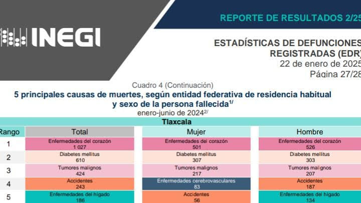 Las cinco principales causas de muertes, según entidad federativa de residencia habitual y sexo de la persona fallecida entre enero a junio de 2024, revela que en Tlaxcala, en total por enfermedades del corazón fueron mil 027, 501 correspondieron a mujeres y 526 a hombres; diabetes mellitus fue un total de 610, de los cuales 307 fueron mujeres y 303 hombres.