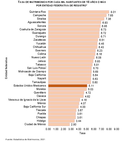Se registraron en total 453 mil 085 uniones nupciales, con lo que se obtuvo una tasa nacional de 5.11 matrimonios por cada mil habitantes de 18 años o más.