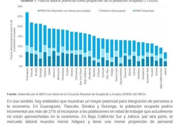 Los resultados muestran un mayor potencial para agregar a más personas al mercado laboral de entidades como Guanajuato, Tlaxcala, Sinaloa y Durango. En Baja California Sur y Jalisco, por otra parte, el mercado laboral muestra una menor cantidad de personas disponibles y con interés en unirse a la población ocupada.