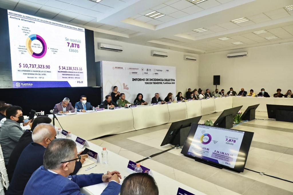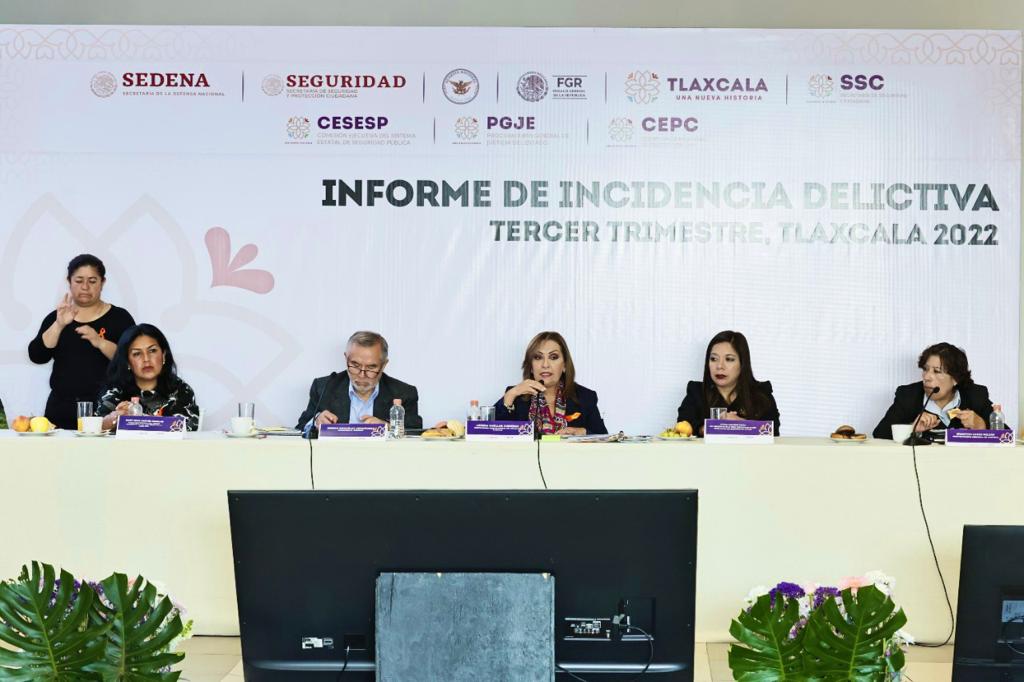 La gobernadora Lorena Cuéllar Cisneros encabezó la presentación del Informe de Incidencia Delictiva correspondiente al tercer trimestre del año, donde se destacó que Tlaxcala se mantuvo por quinto mes consecutivo como el estado con menor incidencia delictiva a nivel nacional, además del avance del 10 al 46 y 48 por ciento en la Certificación Única Policial (CUP) de elementos municipales.