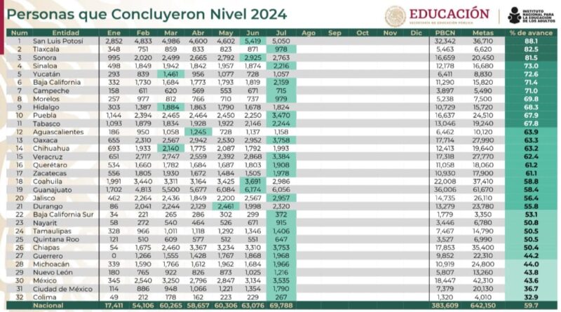 El estado de Tlaxcala ocupa el segundo lugar nacional en abatimiento del rezago educativo, de acuerdo con el avance de cumplimento de la meta institucional y al seguimiento programático por entidad federativa realizado por el Instituto Nacional para la Educación de los Adultos (INEA) con corte al 31 de julio de este año.