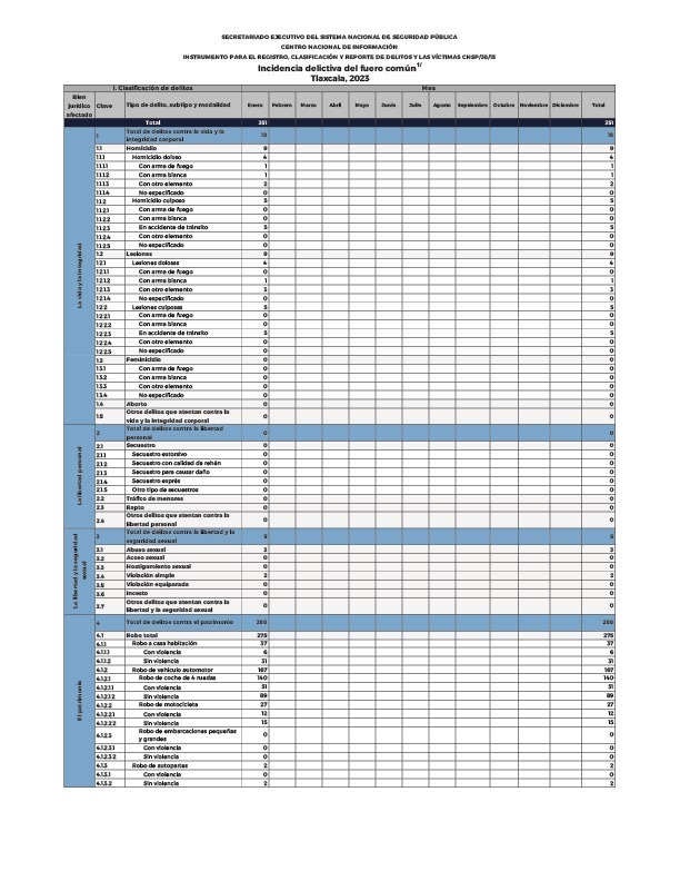 Con base en el informe mensual del Secretariado Ejecutivo del Sistema Nacional de Seguridad Pública (Sesnsp), Tlaxcala reportó 351 delitos del fuero común en enero de 2023, cifra que es 11.6 por ciento menor a las 397 denuncias presentadas ante las agencias del Ministerio Público del mismo mes de 2022.