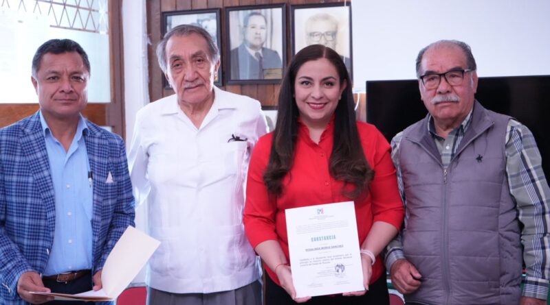 Este día en la sede estatal del Partido Revolucionario Institucional la contadora Rosalinda Muñoz Sánchez recibió la constancia que la acreditada como la abanderada de la Coalición Fuerza y Corazón por Tlaxcala PRI y PAN para contender en los próximos comicios del 2 de junio por la diputación del Distrito Local 02 con cabecera en el municipio de Tlaxco.