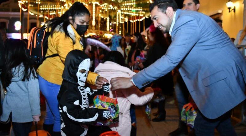 Fue ahí que el presidente municipal, Salvador Santos Cedillo, acompañado de algunas autoridades municipales, entregó dulces a miles de niños que salieron a pedir su “calaverita”, todo en un ambiente de fiesta, música y cultura.